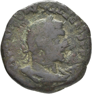 Rückseite: P [M S] - C-O-[L VIM] // AN XI [Jahr 11 = 249-250 n. Chr.]. Weibliche Gestalt (Moesia-Pax) steht in der Vorderansicht, Kopf nach l. In ihrer r. Hand hält sie einen Zweig und in ihrer l. Hand ein Zepter. Über dem Zepter eine Victoria mit Palmzweig und Kranz. Die weibliche Gestalt wird von einem Stier l. und einem Löwen r. flankiert.