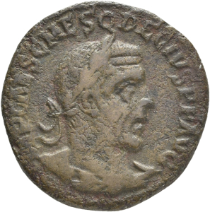 Vorderseite: IMP CAES C MES Q DECIVS P F AVG. Drapierte Panzerbüste des Traianus Decius mit Lorbeerkranz in der Brustansicht nach r.