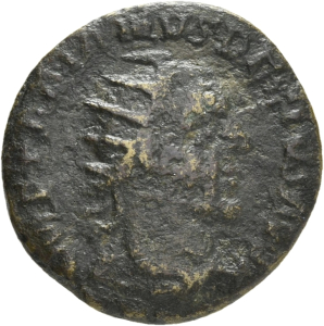 Rückseite: P M S - C-OL VIM // AN XI [Jahr 11 = 249-250 n. Chr.]. Weibliche Gestalt (Moesia) steht in der Vorderansicht, den Kopf nach l. gewandt. In ihrer r. Hand hält sie einen Zweig und in ihrer l. Hand ein Zepter. Über dem Zepter eine Victoria mit Palmzweig und Kranz. Die weibliche Gestalt (Moesia) wird von einem Stier l. und einem Löwen r. flankiert.