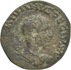 Rückseite: P M S C-OL VIM // AN XII [Jahr 12 = 250-251 n. Chr.]. Weibliche Gestalt (Moesia) steht in der Vorderansicht, den Kopf nach l. gewandt. Sie wird von einem Stier l. und einem Löwen r. flankiert.
