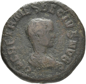Vorderseite: Q HER ETR MES DECIVS NOB C. Drapierte Panzerbüste des Herennius Etruscus in der Rückenansicht nach r.