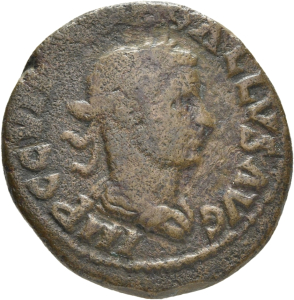 Vorderseite: IMP C C VI[B TREB] GALLVS AVG. Drapierte Panzerbüste des Trebonianus Gallus mit Lorbeerkranz in der Rückenansicht nach r.