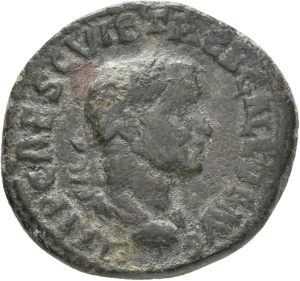 Rückseite: [P M] S [C]-OL VIM // [A]N XIII [Jahr 13 = 251-252 n. Chr.]. Weibliche Gestalt (Moesia) steht in der Vorderansicht, den Kopf nach l. gewandt. Sie wird von einem Stier l. und einem Löwen r. flankiert.